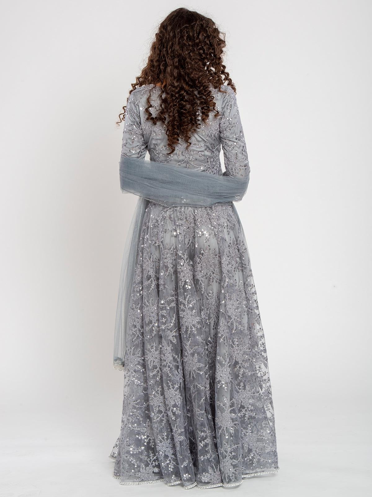 Baltic Grey net lehenga choli with grey and silver sequin embroidery.